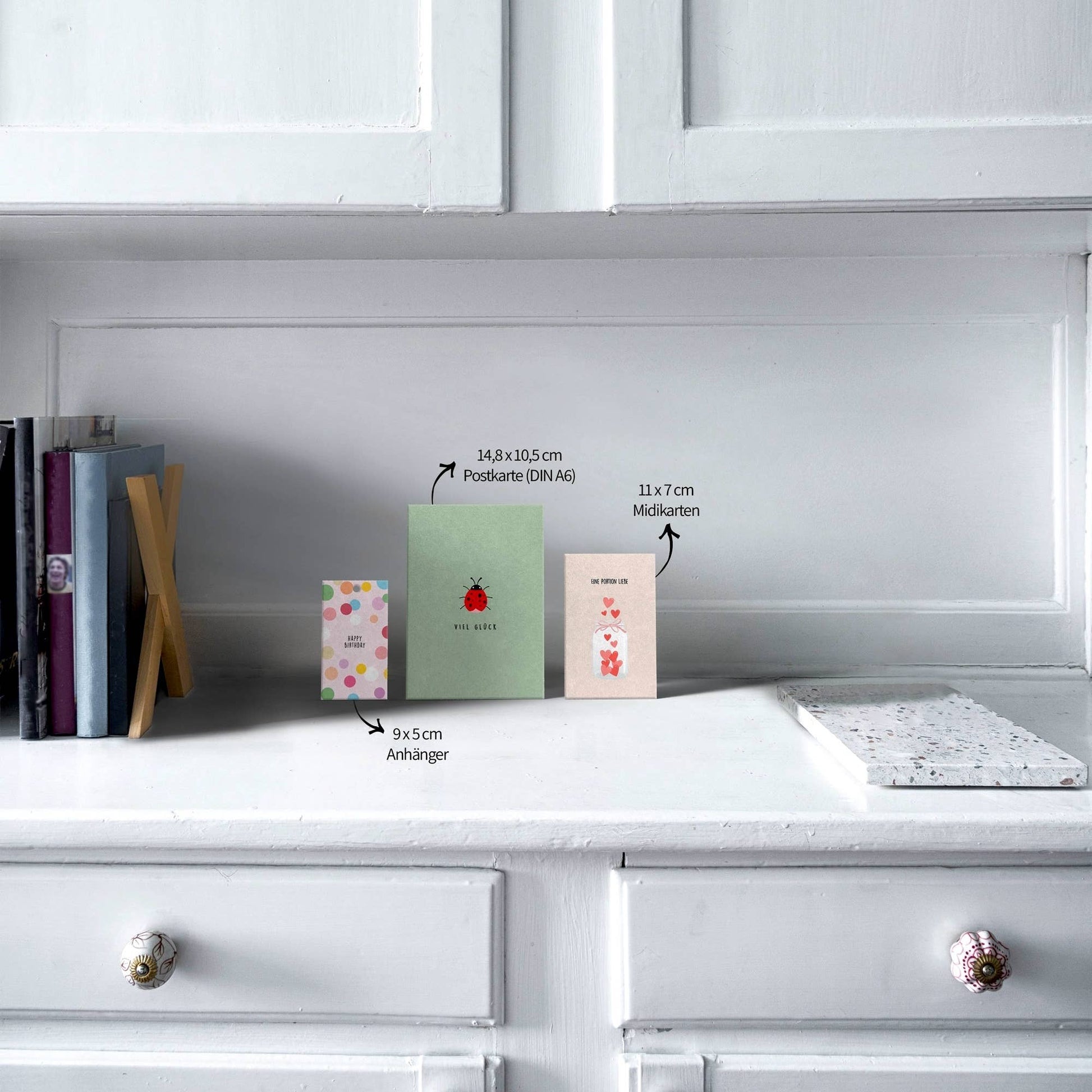 Weiße Rückseite für eine ideale Beschriftung - geringe Mindestmenge (5 Stk. pro Motiv) - Gängige Größe: DIN A6 (14,8cm x 10,5cm x0,2cm) - Gewicht: 9g (je Stk.) - zum Verschicken als Postkarte geeignet